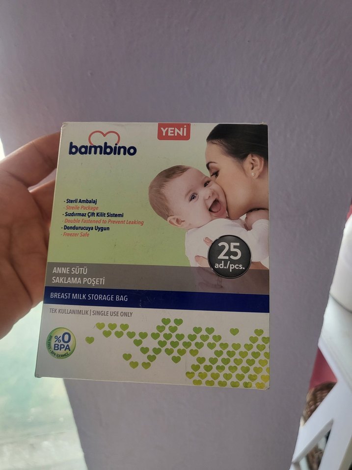 Bambino anne sütü saklama poşetleri, steril ve sızdırmaz özellikte, 25 adetlik pakette. Tek kullanımlık ve BPA içermez.