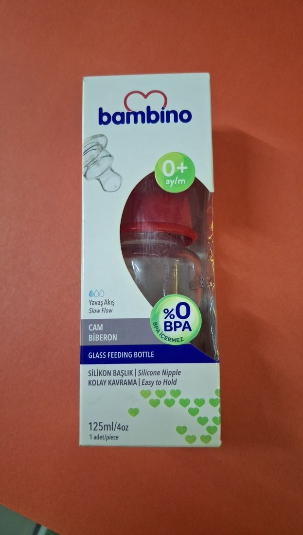 Renkli kırmızı Bambino cam biberon, 125ml kapasite ve silikon yavaş akışlı başlık içerir. BPA içermez ve kolay kavranır. 0 ay ve üzeri için uygundur.