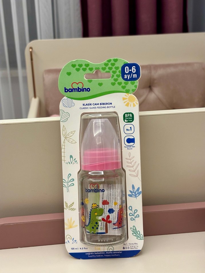 Bambino klasik cam biberon, 0-6 ay bebekler için uygundur. Pastel pembe kapak ve renkli hayvan desenlerine sahiptir. BPA içermez, güvenlidir.