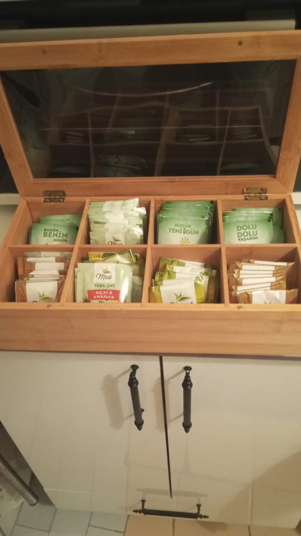 ahşap makyaj organizer veya çay kutusu, çoklu bölmeler ve şeffaf kapak içerir. Anneme hediye geldi fakat mutfak küçük kullanamıyo ölçüleri fotoya eklenmiştir