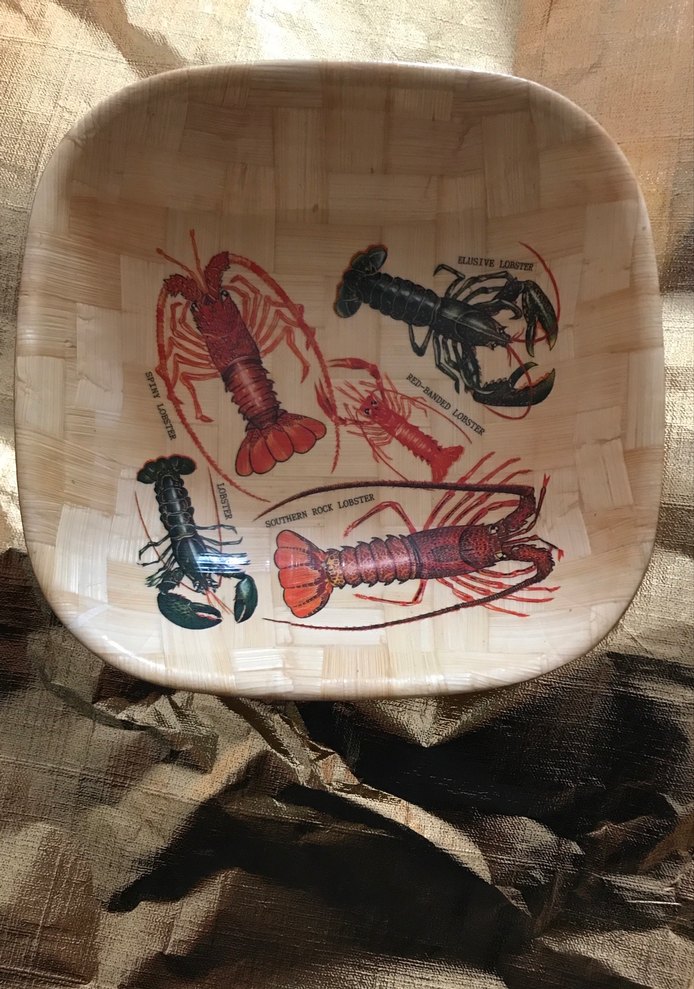 Çok renkli, doğal görünümlü, bambu çerezlik. Üzerinde ıstakoz çizimleri bulunur, 15x15 cm genişliğindedir.
