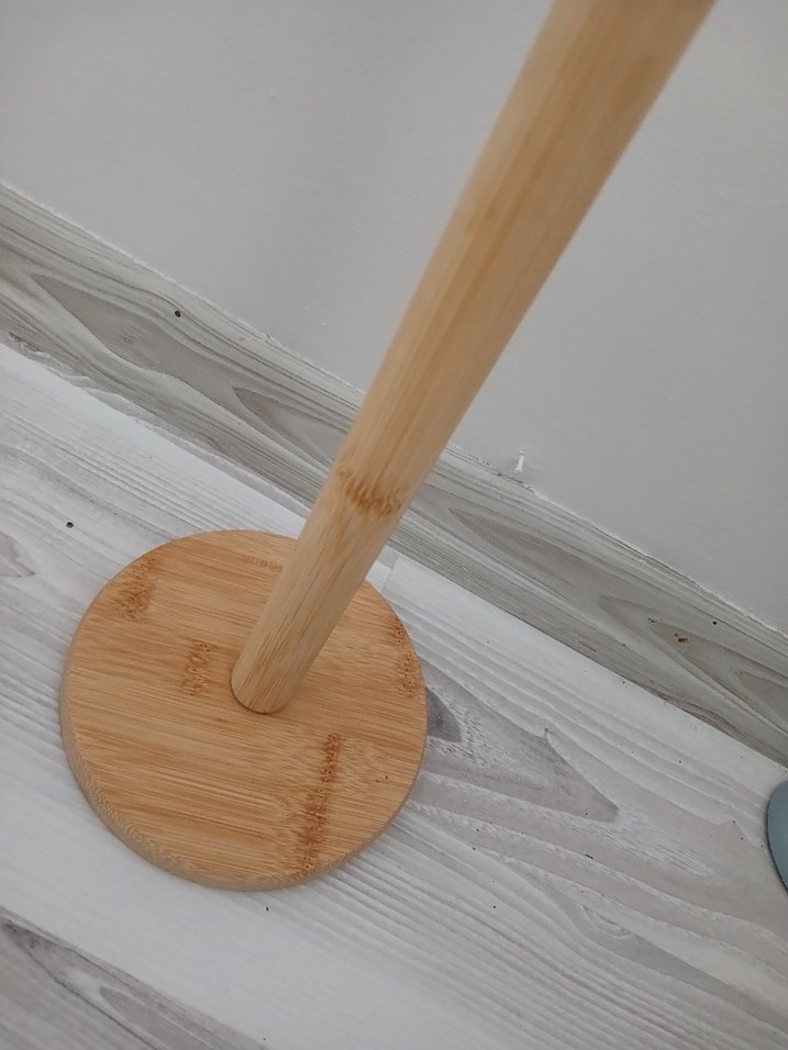 Yuvarlak tabanlı ve uzun dikey direkli bambu kağıt havluluk, mutfakta düzen sağlar. Doğal ahşap rengi, bej ve gri tonlarla uyumludur.