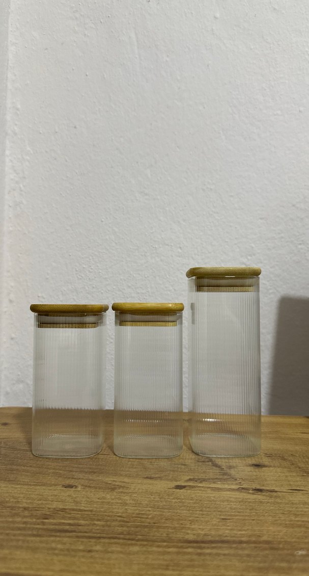 Üç farklı boyda, bambu kapaklı şeffaf cam saklama kavanozları seti, mutfakta çok amaçlı kullanım için uygundur.