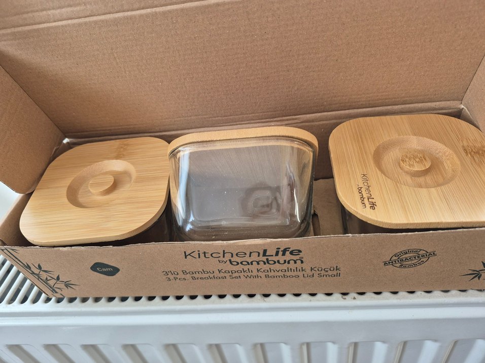 Bej renkte, bambu kapaklı üç küçük kahvaltılık kabı içeren set. Şeffaf kaplar ve hafif bambu kapaklar KitchenLife markalıdır.