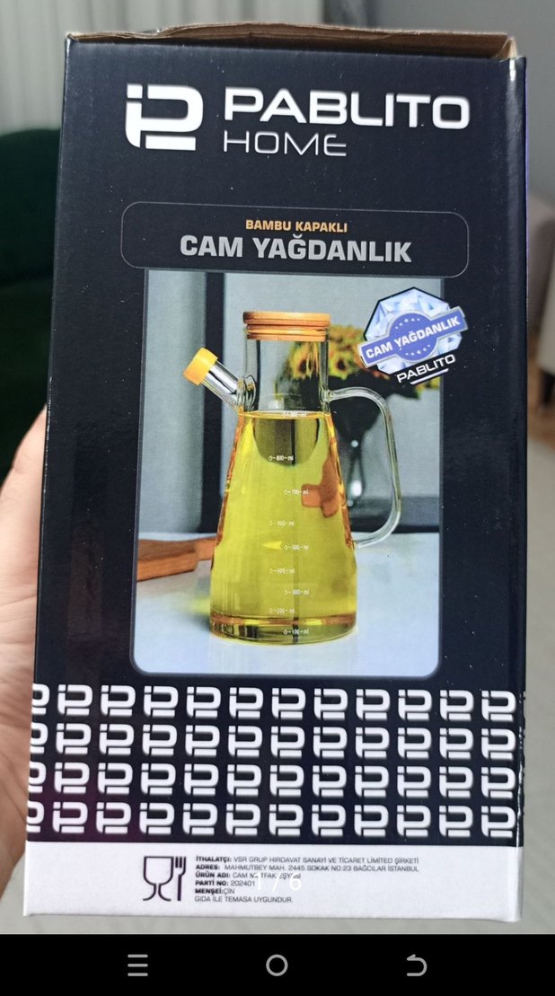 Bambu kapaklı, koyu sarı camdan yapılmış yağdanlık, tutma sapı ile kolay kullanım sağlar.