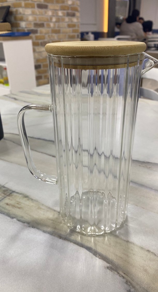 Dikey çizgili şeffaf cam sürahi, bambu kapaklı, hafif ve doğal görünümlü.