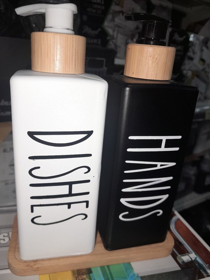 Bambu kapaklı, "Dishes" ve "Hands" yazılı iki sıvı sabunluk seti. Ahşap bir taban üzerinde yer alır.