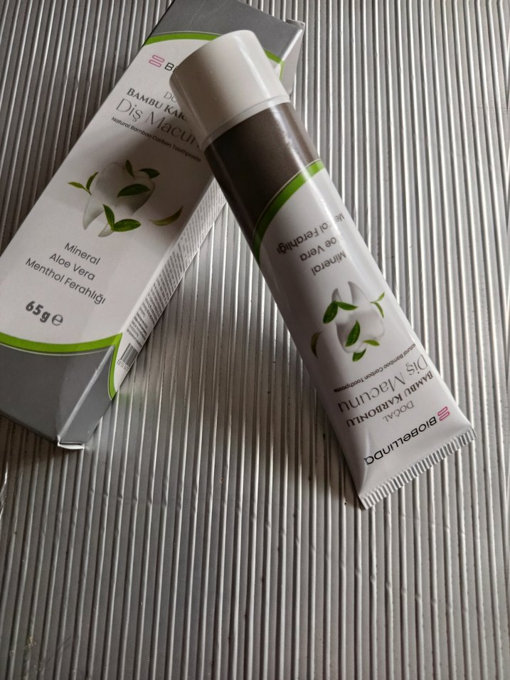 65g'lık bambu karbonlu diş macunu, mineral, aloe vera ve mentol içerir, ferahlatıcı temizlik sağlar.