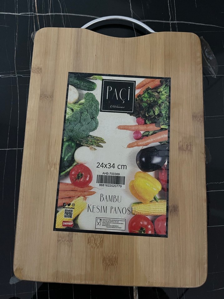 Ürün hiç kullanılmadı paketli 24x34 cm ölçülerinde, dayanıklı ve çevre dostu bambu kesim panosu. Mutfakta kullanıma uygundur.