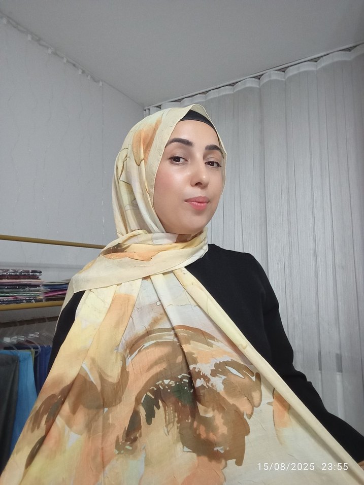 Kadınlar için camel renkli, saten dokulu, drapeli şal. Hafif ve akışkan yapısıyla bohem ve modest stil için uygundur.