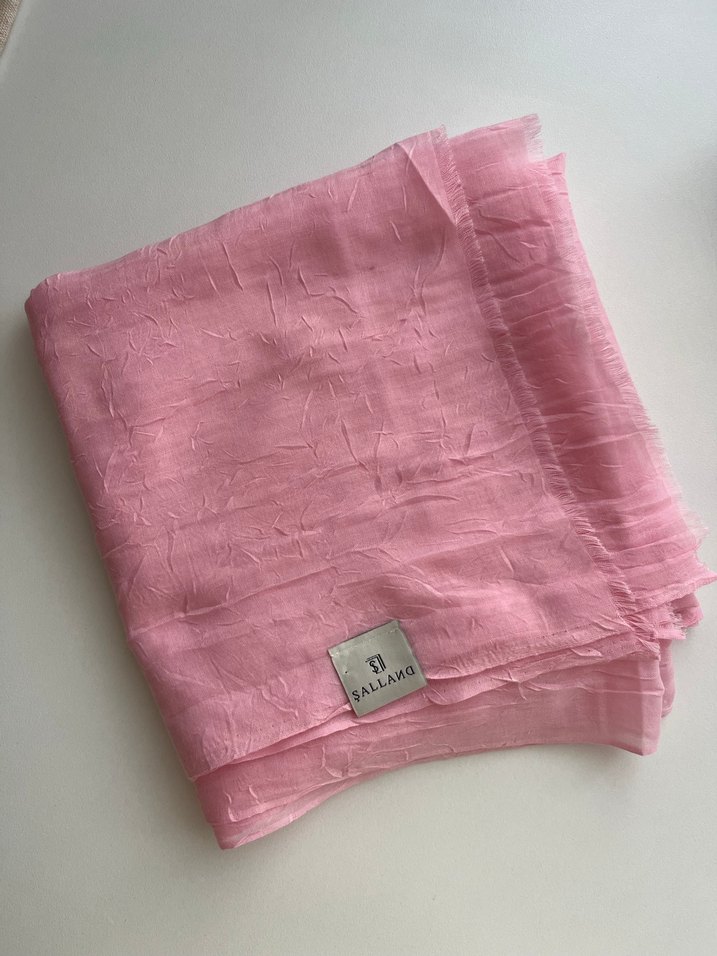 Pastel toz pembe renkte incecik bir kumaşı var . Marka temsili öne çıkması için ekledim .Şalland mağazasından almıştım . Çok belli olmayan bir fondoten lekesi var son görsele ekledim yıkayınca muhetemelen çıkacaktır .