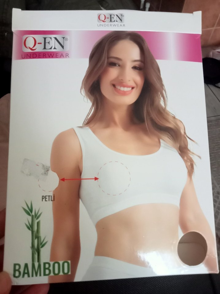 Bambu kumaştan yapılmış bej renkli, kısa kesim ve baskılı tasarımlı spor sütyeni. Günlük konfor için normcore tarzında. marka temsilidir.