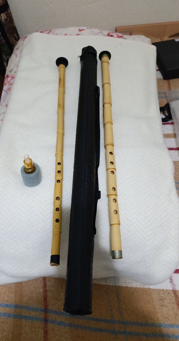 İki bambu ney flüt, temizleme aparatı ve siyah taşıma kılıfı içeren set. Flütler parmak deliklerine ve metal detaylara sahiptir.
