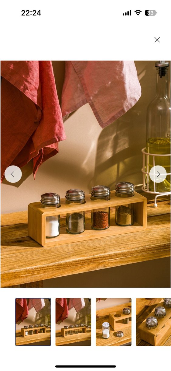 Dört cam baharatlık metal kapaklı, açık bambu çerçevede yer alır. Mutfakta baharatları düzenlemek için kullanışlıdır.