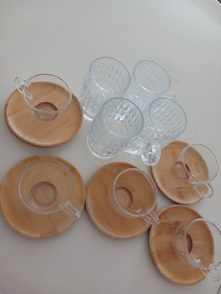 Şeffaf cam fincan ve bardaklar, bambu tabanlı açık bej altlıklara sahip doğal bir sete sahiptir. bir tane fincan eksik kırıldı yanında kulplu çay fincana hediye