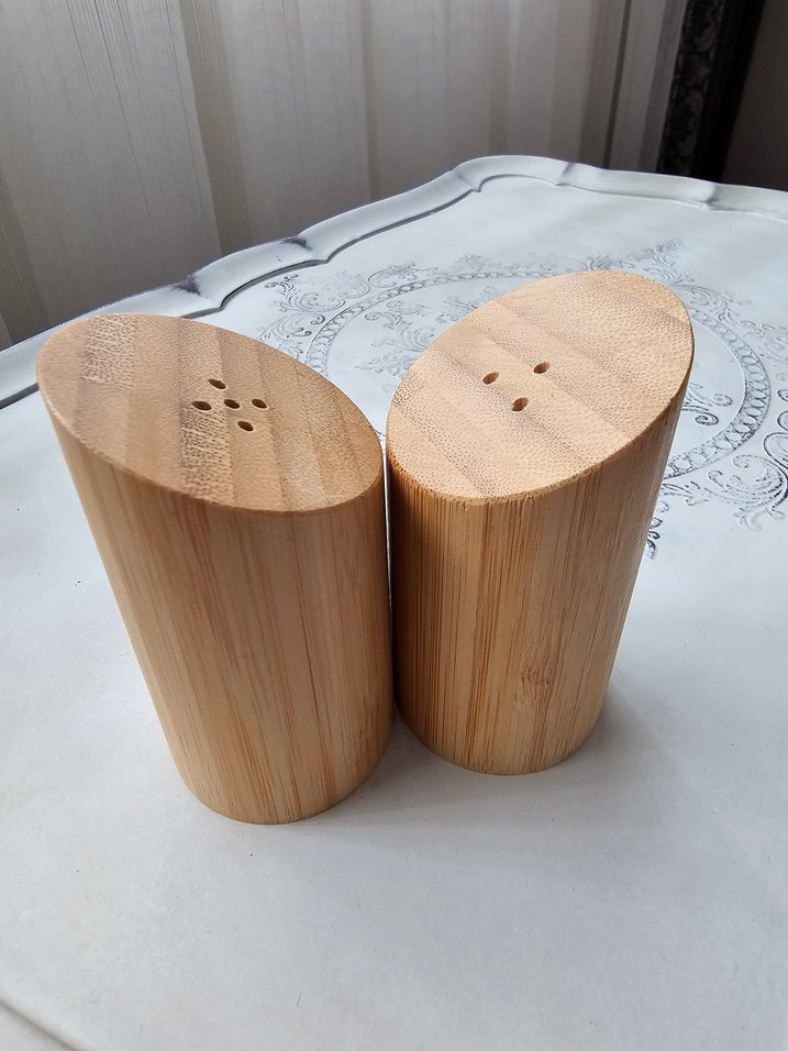 Açık bej renkte, bambudan yapılmış tuz ve karabiber seti, mutfakta kolay baharatlama için tasarlanmıştır. Bir iki denendi fazlaliktan satışta. marka temsili