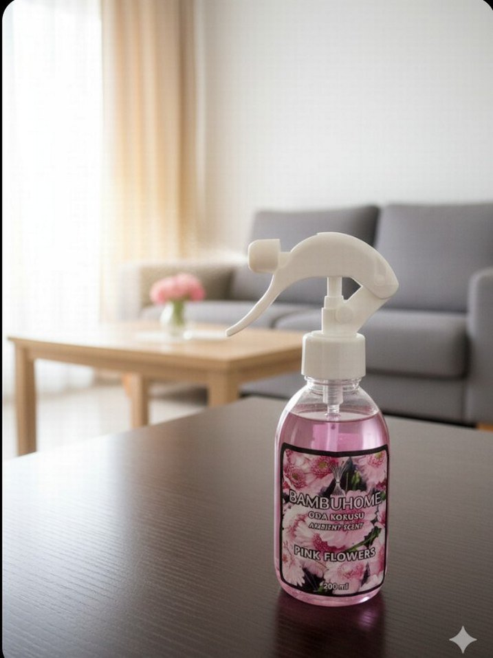 Bambuhome Pembe Çiçek oda kokusu, yaşam alanınıza taze ve çiçeksi bir koku verir. 250 ml sprey şişede sunulur.