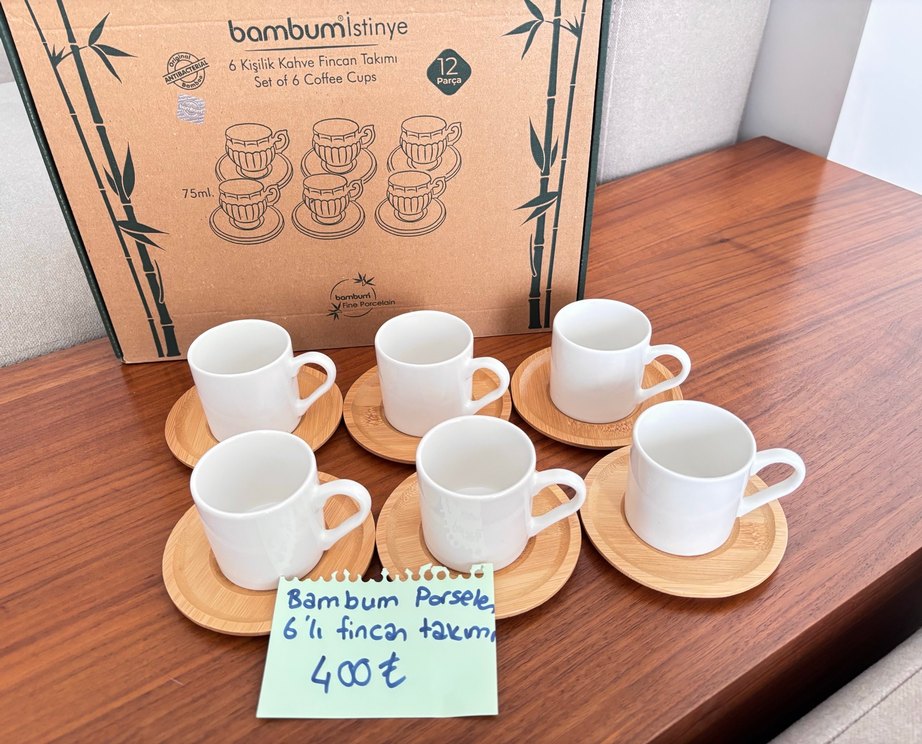 Bambum 6'lı beyaz kahve fincan takımı, her biri bambu tabaklıdır. Türk kahvesi içmediğim için iki üş sefer kullandım. Yurtdışına taşındığım için satılıktır.