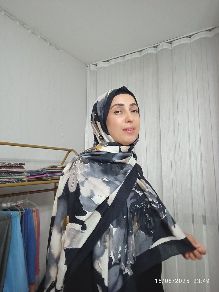 Drapeli tasarıma sahip siyah ve gri tonlarda, yumuşak sentetik kumaştan yapılmış kadın şalı. Çağdaş bohem stile uygundur.