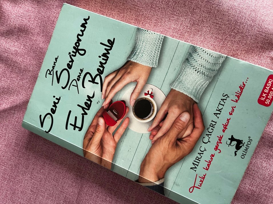 Miraç çağrı aktaşın 'baba seni seviyorum deme Evlen Benimle' adlı romanı, kahve fincanı ve kırmızı yüzük kutusu tutan ellerin olduğu romantik bir kapak sunar.