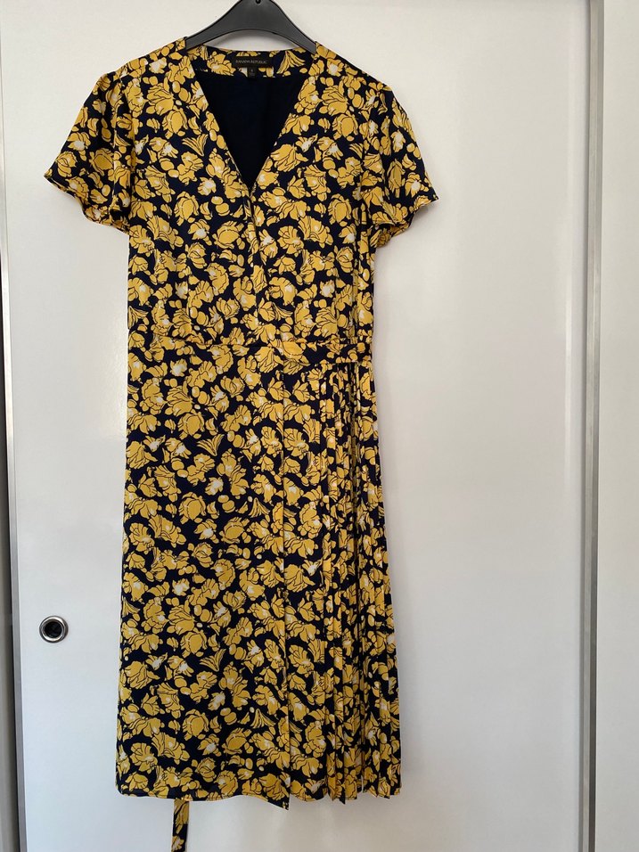 108 boy, 42 üst beden uzunluğu, 48 cm gögüs( ama anvelop tarzı olduğu için daha da geniş olabilir. ) 18 kol uzunluğu, 22 kol ağzının genişliğidir. Komple astarlıdır, 1 kez nikaha giyilmiştir. Gögüs bölgesine terziye agraf yaptırılmıştır, sökülebilir.Sarı çiçek desenli midi elbise, kısa kollu ve V yakalıdır. İpeksi kumaş ve drapeli yapısıyla bohem tarzını yansıtır. Rahat ve salaş kesimlidir.