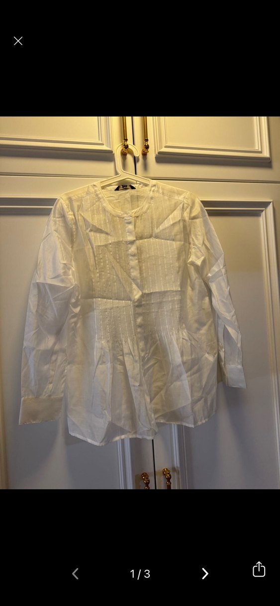 Düğmeli ön cepheli, uzun kollu, yuvarlak yakalı beyaz keten gömlek, bol kesim ve vintage bohem tarzıyla ofis için uygun.