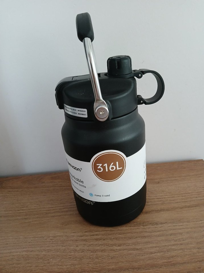 Siyah renkte paslanmaz çelikten üretilmiş, sağlam saplı ve güvenli kapaklı matara. Sıvıları sıcak veya soğuk tutar.