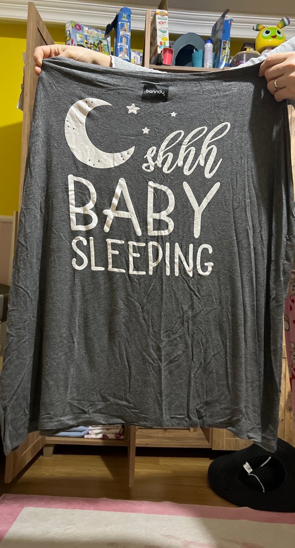 Pamuklu, gri, uzun kollu ve bol kesim hamile tişörtü. Önünde "shhh BABY SLEEPING" baskısı ve salaş bir drape stili bulunur.