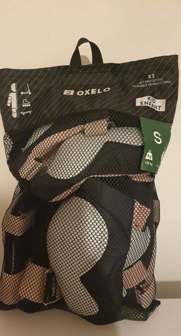 Bantlı tasarıma sahip siyah motosiklet diz koruyucuları, baskılı sentetik kumaştan üretilmiştir ve koruma sağlar. kız çocuklar için S beden.