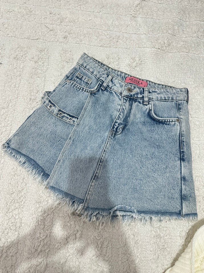 Bantlı bel detayı ve bol kesimiyle pastel mavi kot şort. Kısa paça ve salaş tarzıyla günlük sokak stiline uygun.