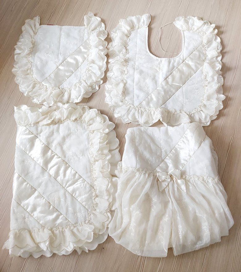 Bej nakışlı yumuşak sentetik kumaştan yapılmıştır. Fırfırlı kenarlarla birden fazla uyumlu parçadan oluşur.