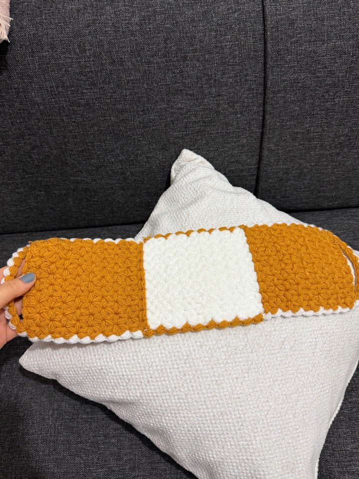 Hardal ve ekru renklerde kareli desenli, örgü çocuk battaniyesi, sıcak tutar ve yumuşaktır.