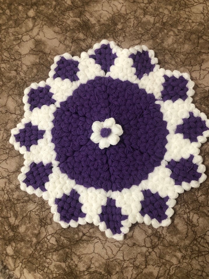 Koyu mor ve beyaz renklerde, örgüden yapılmış, çiçek desenli yuvarlak banyo lifi Yumuşak ve rahat bir dokusu vardır.