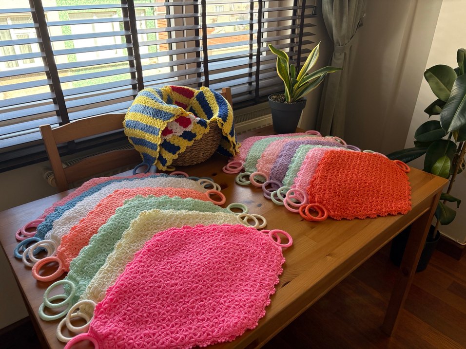 Yumuşak dokulu, el örgüsü renkli banyo lifleri. Tutma kısımlarında yuvarlak halka kullanılmıştır. 2 li olarak satılmaktadır. ( 200 TL ) Ölçü: 42*30