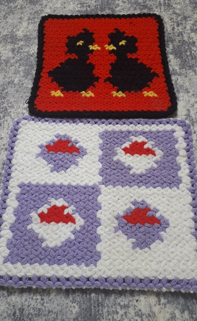İki adet çok renkli, koyu tonlarda banyo süngerinden oluşan set. Biri kırmızı zeminli siyah desenli, diğeri beyaz ve mor tonlarında kırmızı detaylıdır.