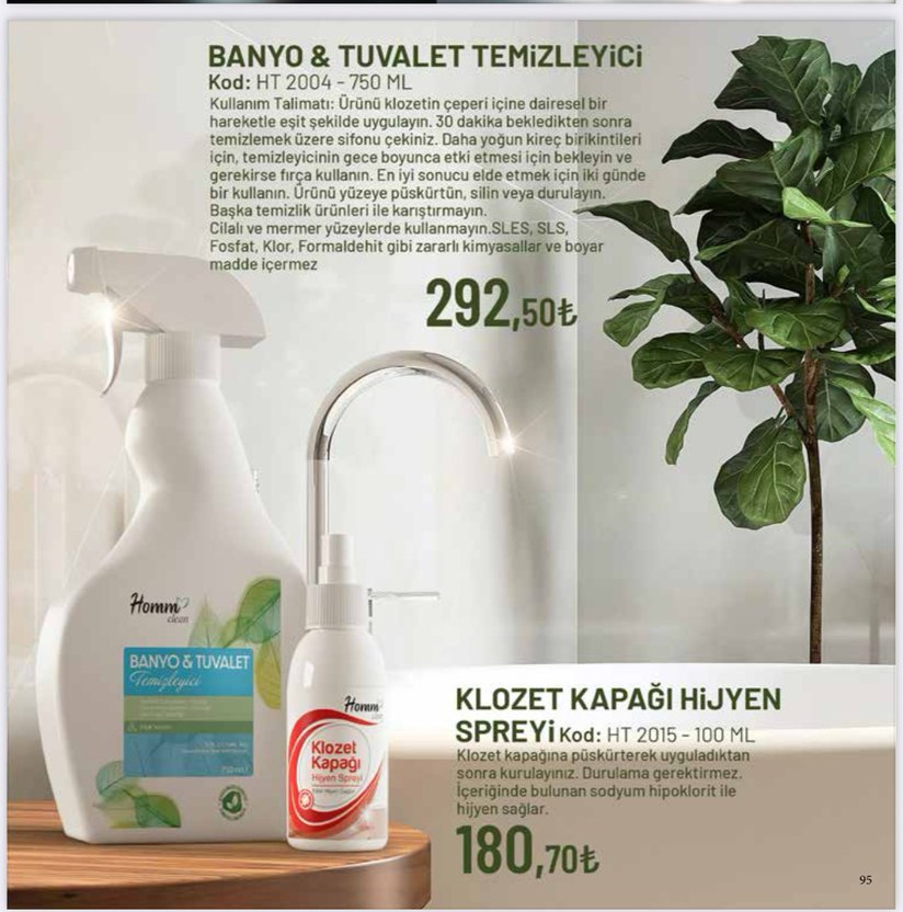 Banyo ve tuvalet temizleyici 750ml şişede olup klozet içine dairesel hareketle uygulanır. SLES, SLS, fosfat, klor, formaldehit içermez. Klozet kapağı hijyen spreyi 100ml, sodyum hipoklorit içerir, durulama gerektirmez. Hijyen sağlar.Kadir ezildi Homm bitkisel herbirinin fiyatı farklıdır dmden iletişime geçin