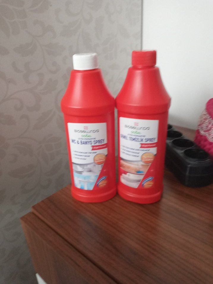 Kırmızı kapaklı, banyo ve tuvalet temizliği için kullanılan iki sprey şişesi seti. Her şişede kolay kullanım için vidalı kapak bulunur.