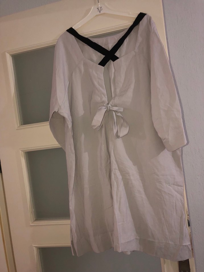 İlk fotoğraf arka tarafıdır. Arkası siyah detaylı ve bol kesim gri tunik. Midi boyda, günlük kullanıma uygun.