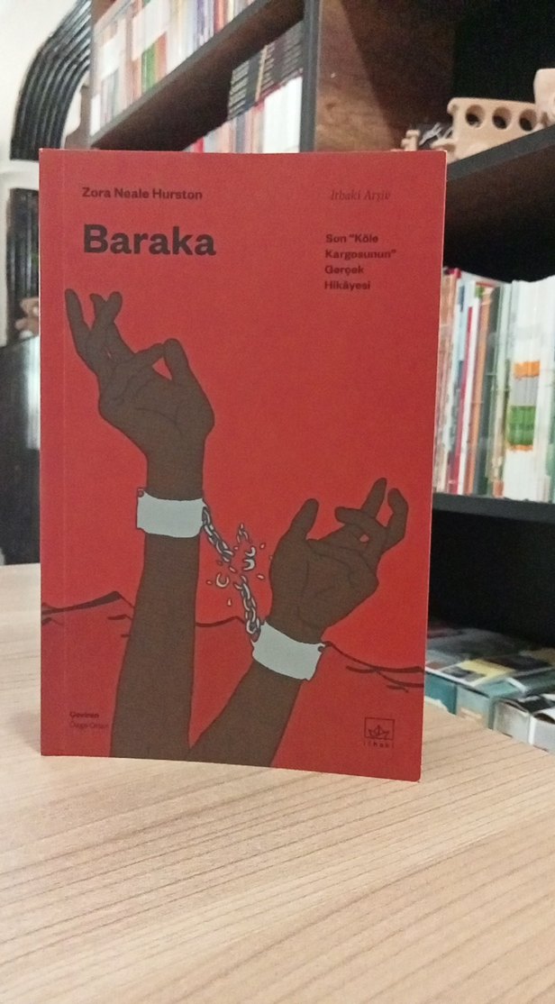 Zora Neale Hurston'ın Baraka adlı romanı, özgürlük ve mücadele temalarını işliyor. Kapakta kelepçeli eller yer alıyor. Kitap, "Son 'Köle Kargolarının' Gerçek Hikayesi" gibi hikayeler içeriyor.