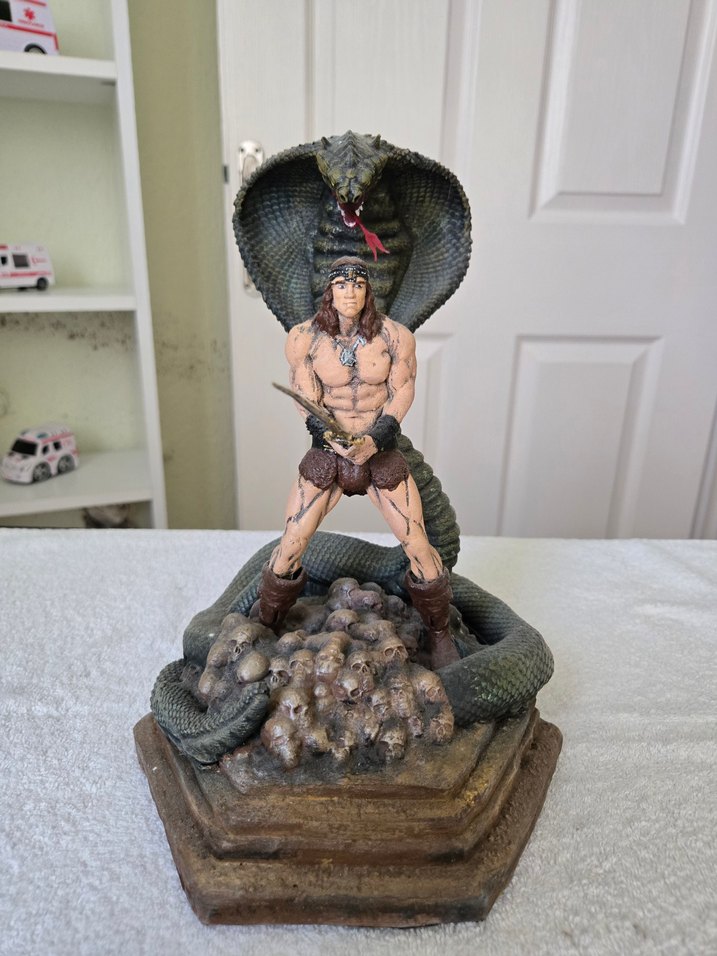Kobra arkasında duran kaslı savaşçı figürü, kafataslarıyla çevrili bir taban üzerinde. Koyu deve tonlarında detaylı, savaşmaya hazır bir pozda.