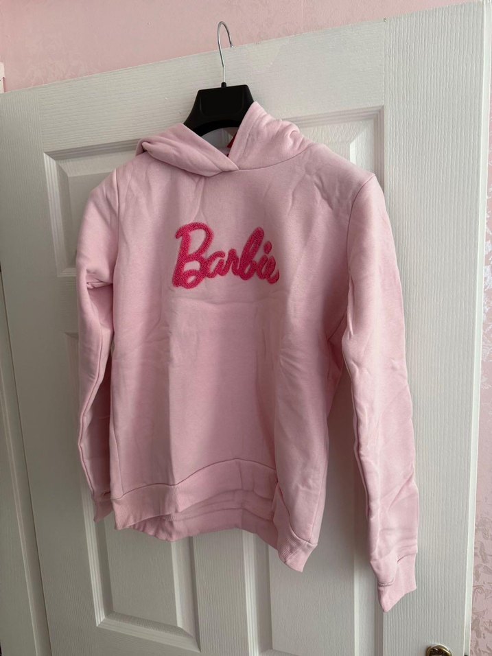 Uzun kollu, bisiklet yaka ve düğmeli detaylı, Barbi baskılı pastel pembe kız sweatshirtü. Yumuşak ve sıcak kumaştan, trend sokak tarzı için uygun.