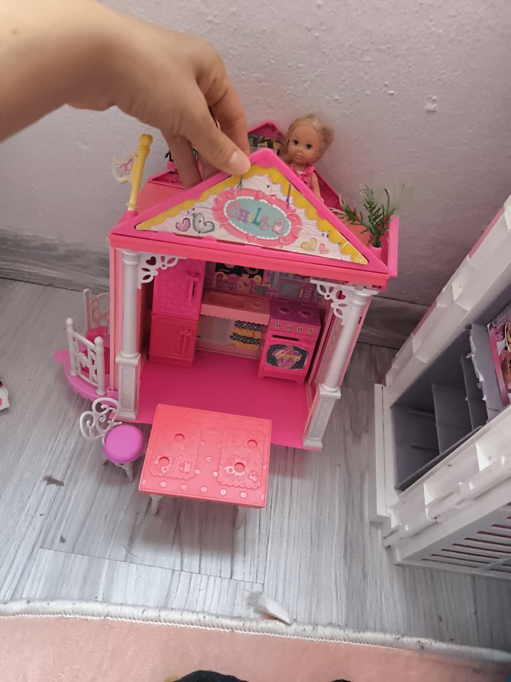 Pastel pembe mini oyun evi oyuncak, detaylı mobilyalar ve küçük bebek içerir. Hayal gücünü destekler.
