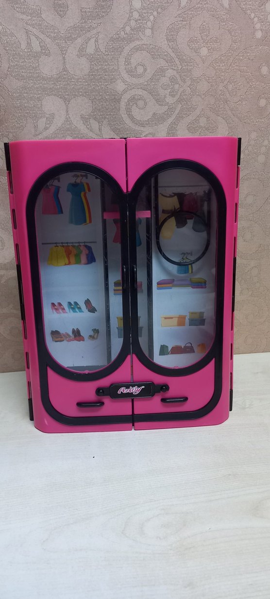 Renkli pembe çocuk dolabı oyuncağı, içinde kıyafetler, ayakkabılar ve aksesuarlar detaylı şekilde görünüyor.