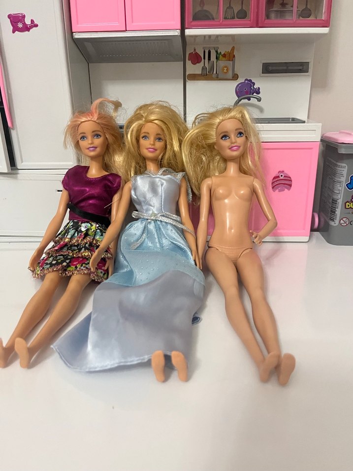 Üç açık renk pembe bebekten oluşan set, ikisi renkli ve parlak elbiseler giymiş, biri çıplak, pembe mutfak oyun seti önünde yer alıyor.