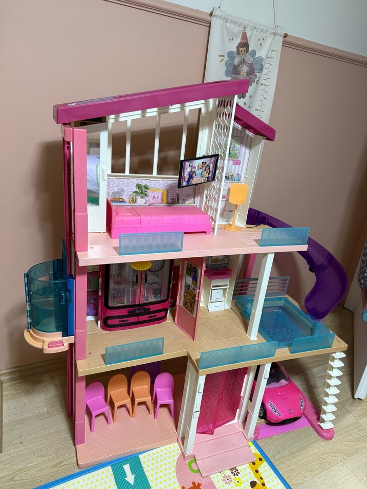 Çok odalı, mobilyalı ve aksesuarlarla donatılmış barbie evi Sandalyeler, kaydırak , gardrop ve oyuncak araba içerir. En son görselde kaydırağın orda bulunan parça kırılmıştır herhangi bir engel yoktur fiyata yansıttım