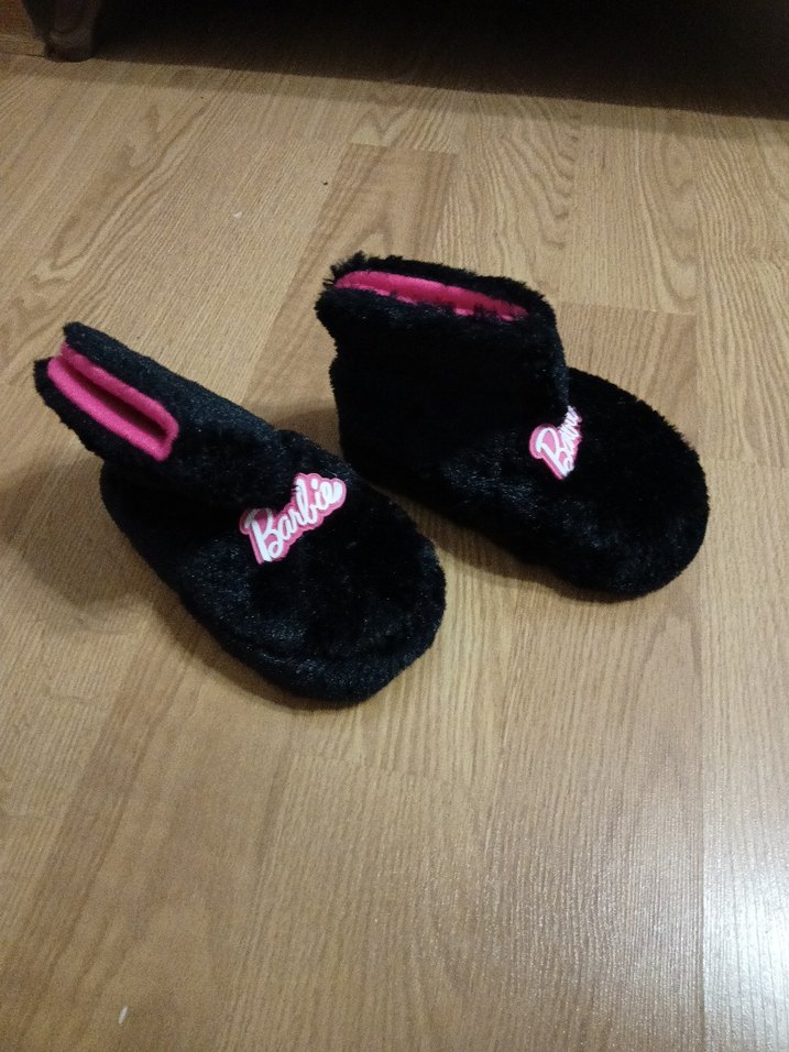 Kız çocukları için siyah, yumuşak peluş detaylı ve pembe nakışlı sıcak ev terlikleri. Rahat ve konforlu. Ürün hiç kullanılmadı