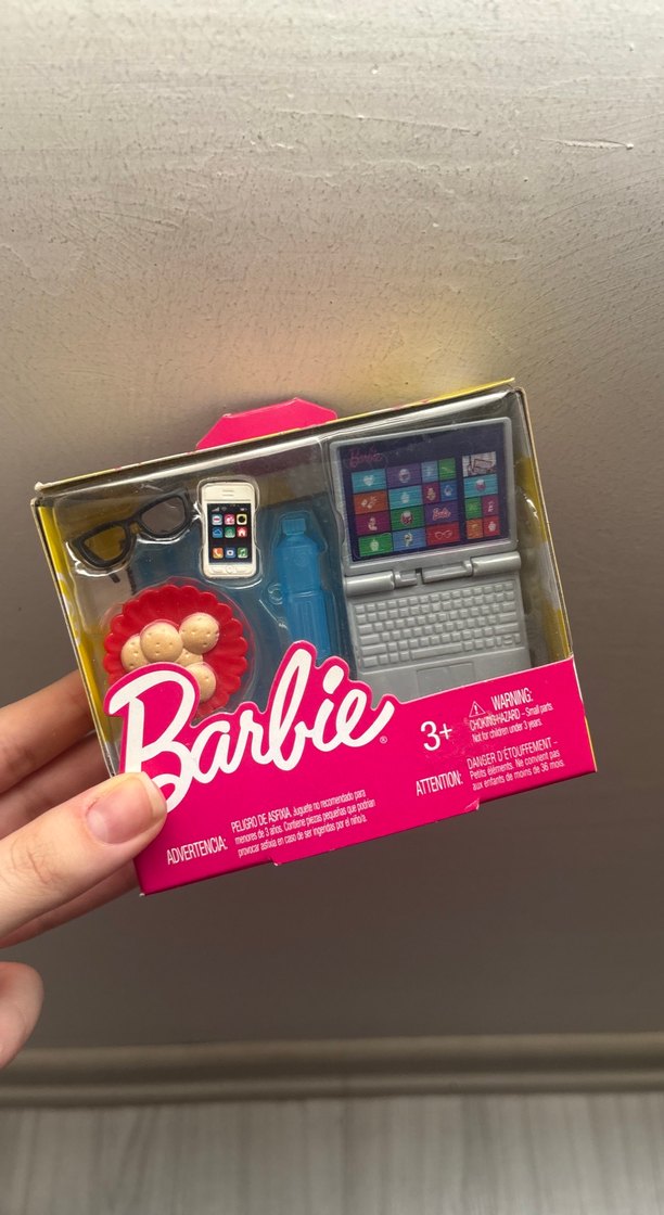 Barbie aksesuar seti, koyu pembe tonlarda gözlük, telefon, su şişesi ve dizüstü bilgisayar içerir. 3 yaş ve üzeri için uygundur.