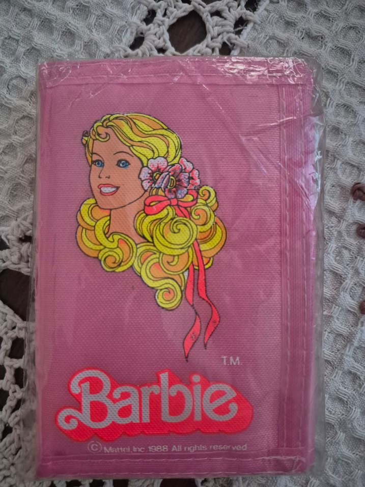 Pastel pembe renkte, Barbie baskılı çocuk cüzdanı, pop kültür ve retro tarzı bir araya getiriyor.