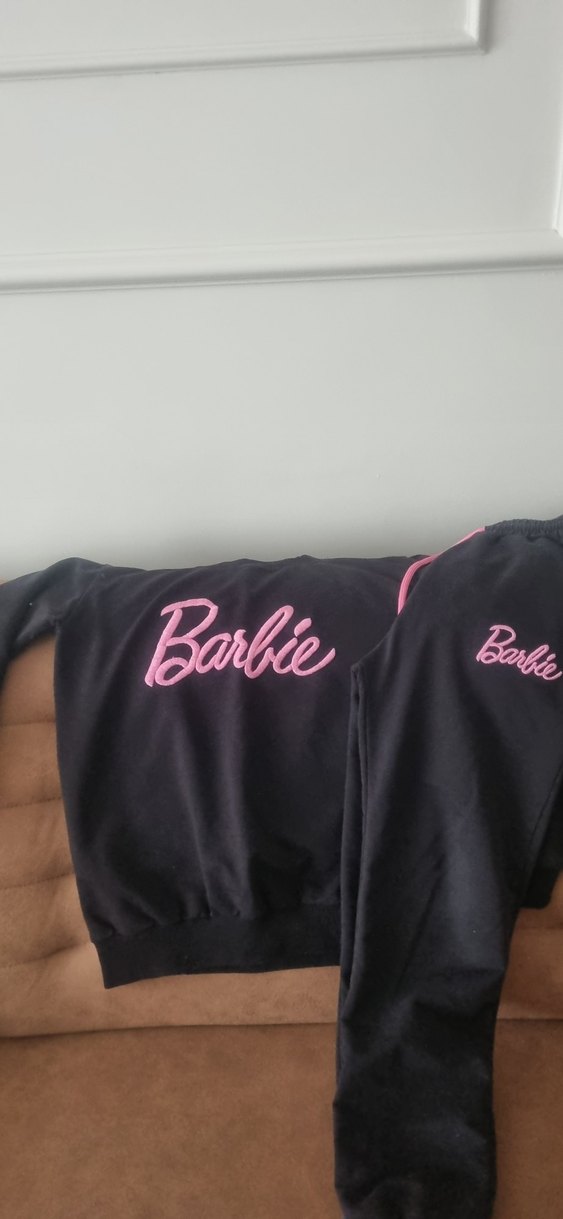 Koyu pembe renkte, bol kesim ve düğmeli detaylara sahip eşofman takımı. Uzun kollu ve bisiklet yaka, yumuşak ve rahat kumaş ile Barbie baskılı.