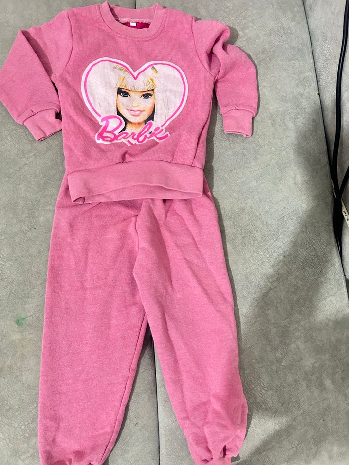 Pembe renkli kız eşofman takımı, önünde renkli Barbie baskısı bulunur. Uzun kollu, yuvarlak yaka ve rahat kesim ile yumuşak örme kumaştan üretilmiştir. Sorunsuz ve tertemizdir 3-4 yaşa uygundur . Marka temsilidir.